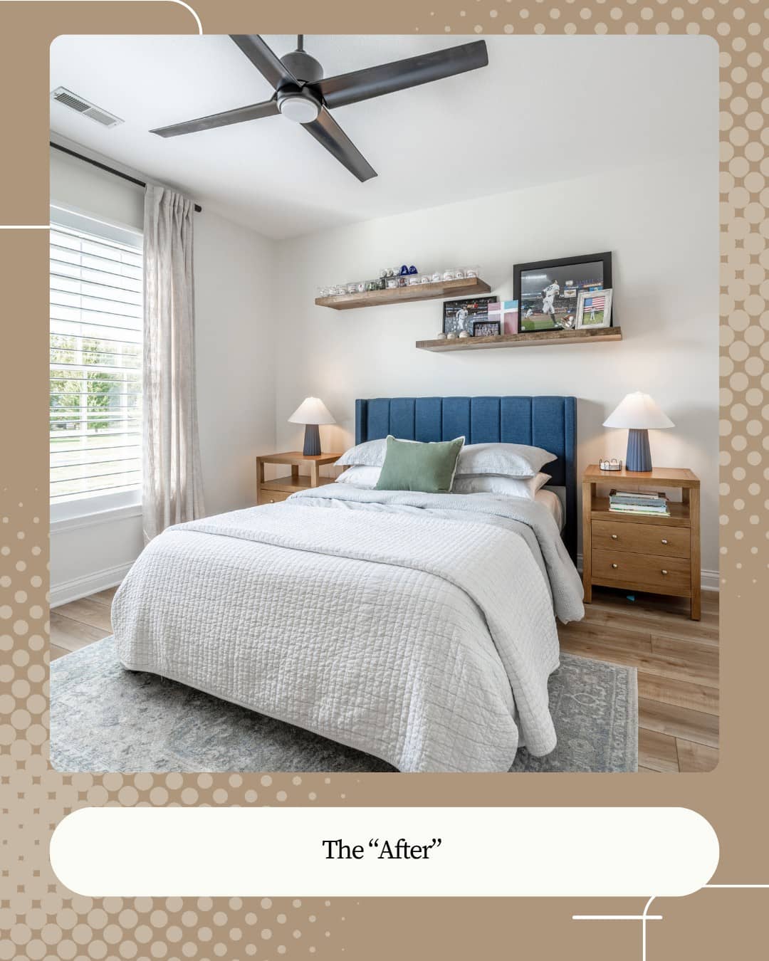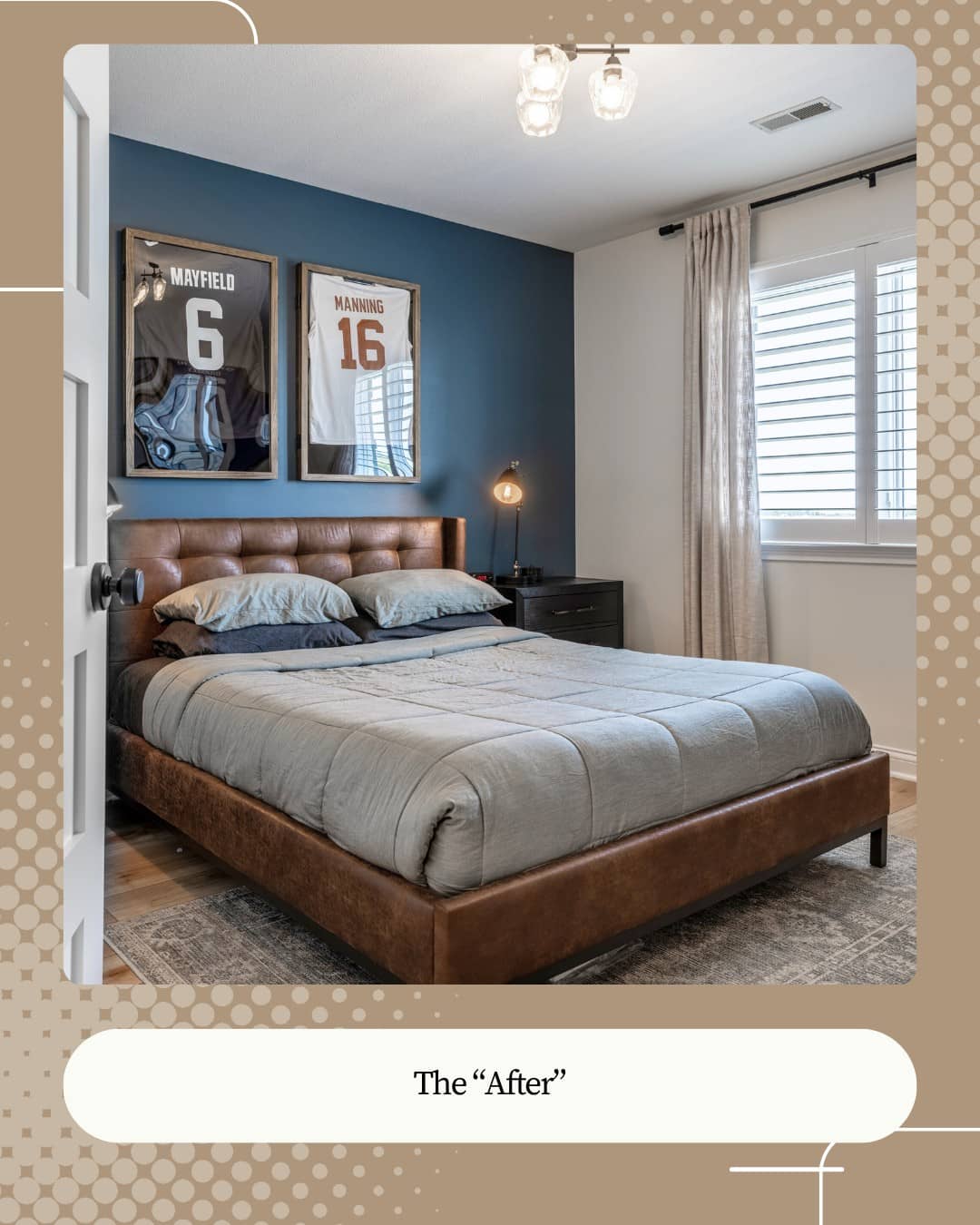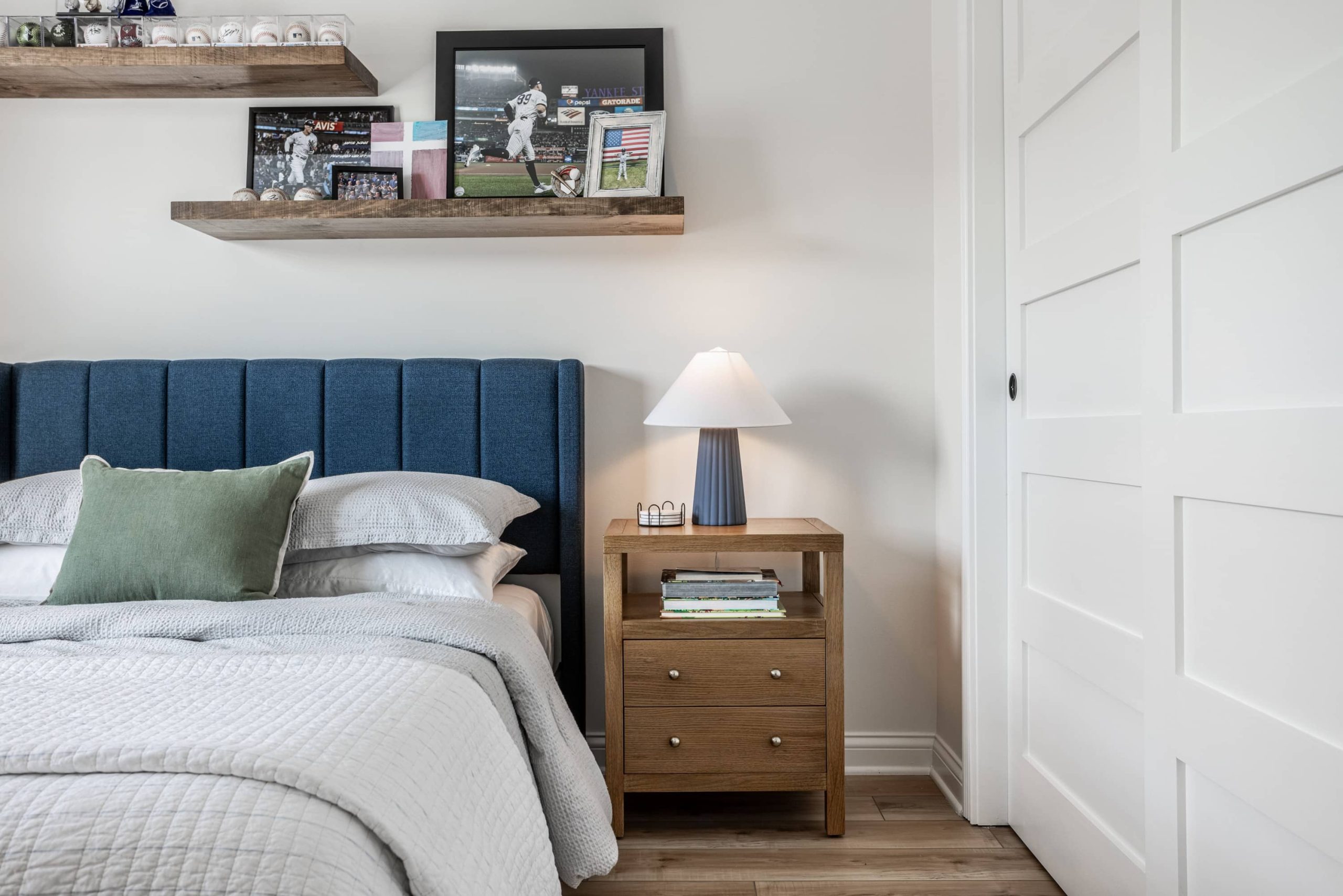 - Boys’ Bedrooms: Personalized spaces with floating shelves, framed jerseys, and slate blue accents.