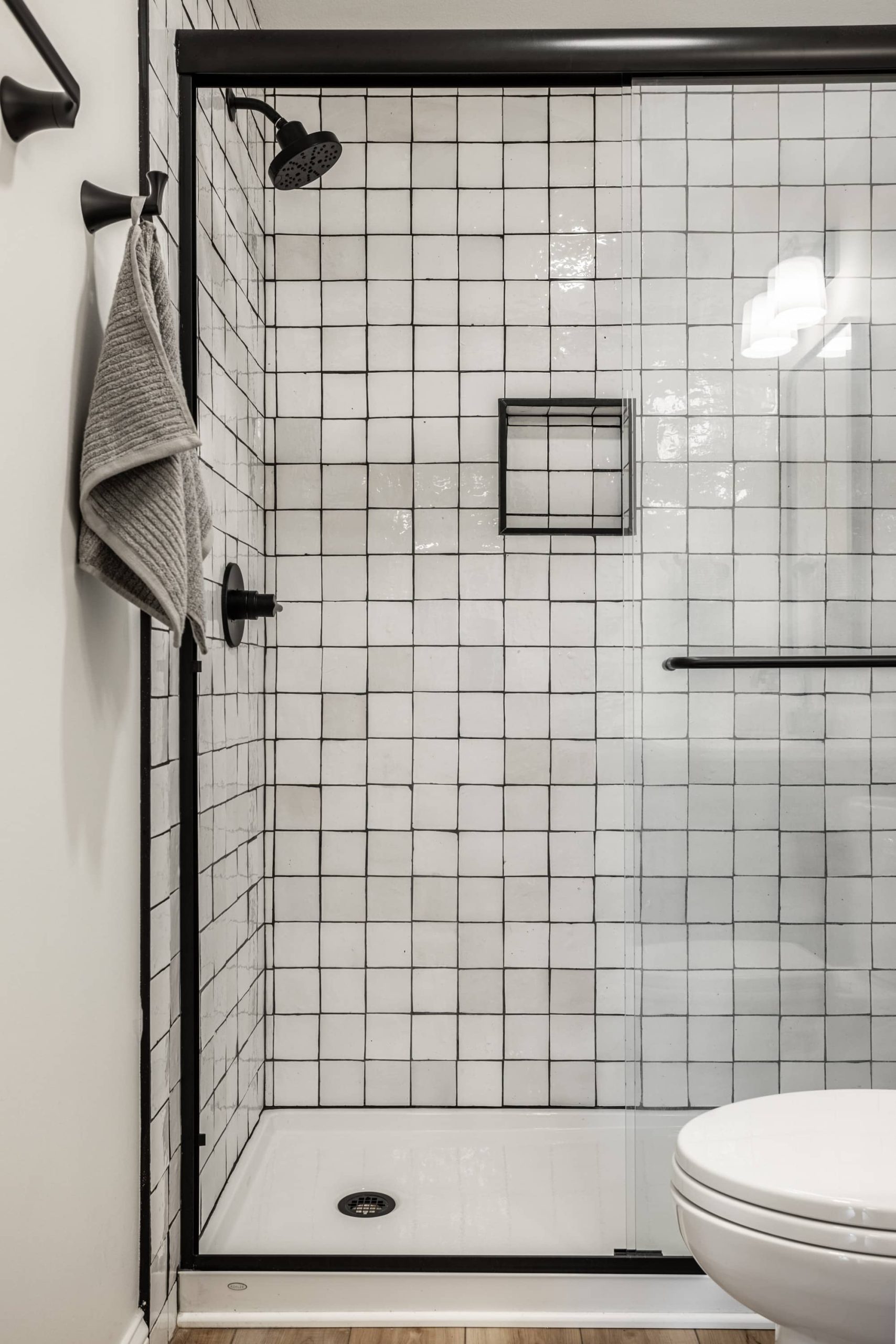 - Primary Suite: Hand-laid Zellige tile, matte black fixtures, freestanding tub, quartz counters.