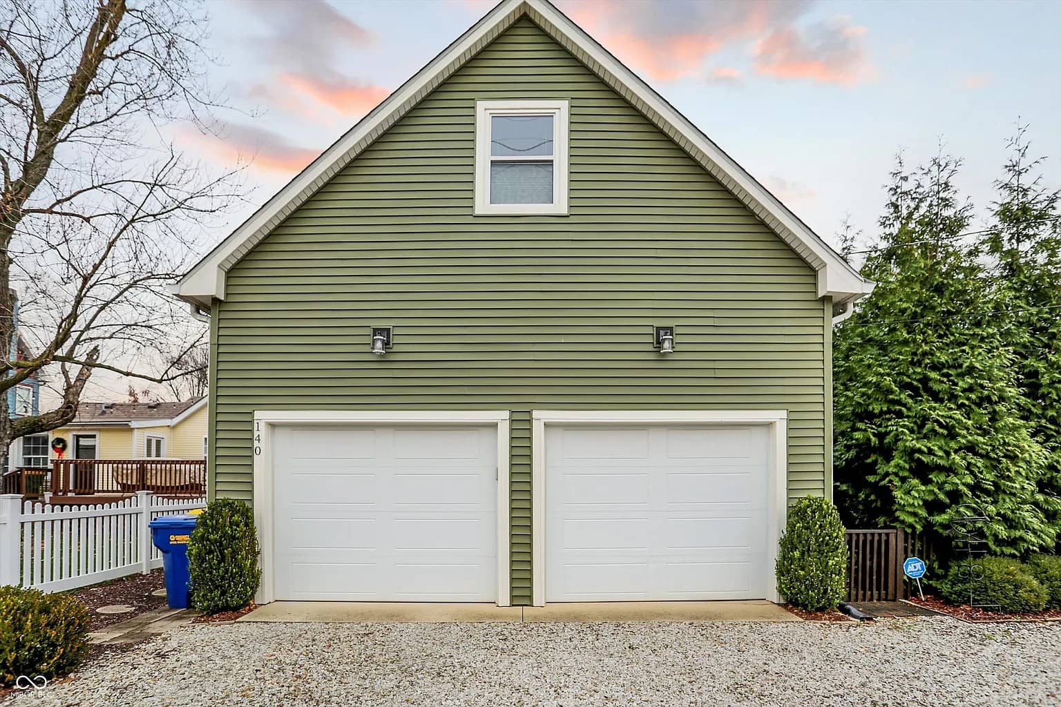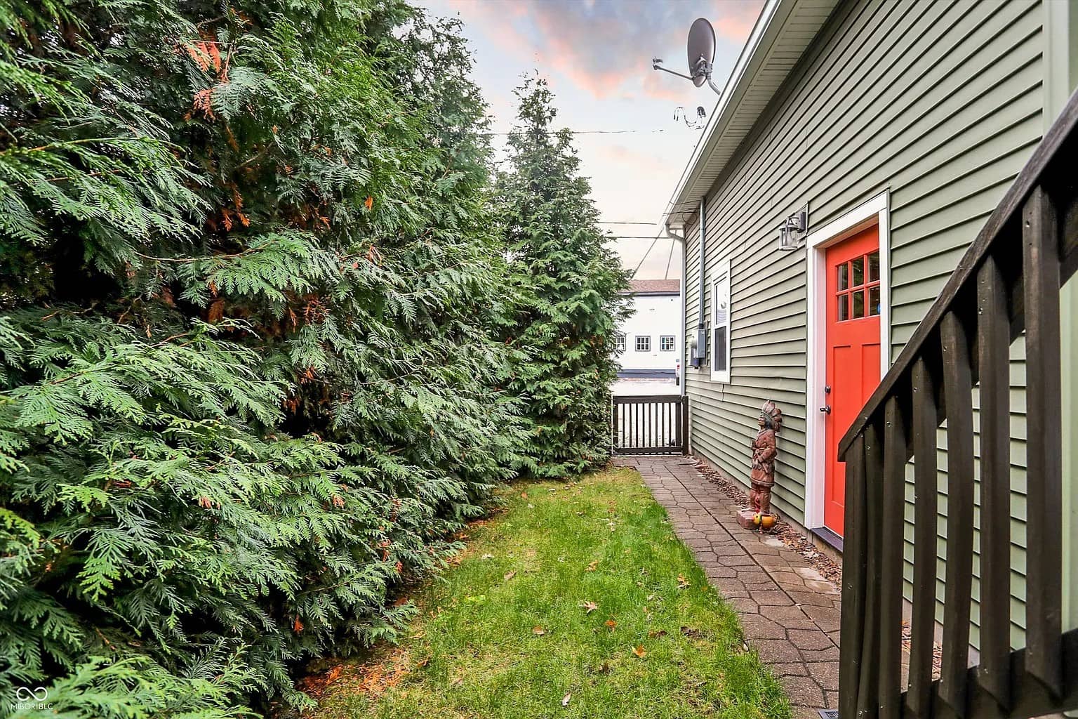 Charming historic neighborhood with colorful renovated homes and cars parked along a brick-paved street at sunset.